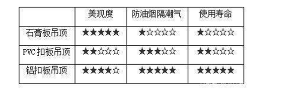 PVC扣板吊頂:PVC扣板以PVC為原料,具有防水、防潮、防蛀、阻燃等優點,但是塑料材質的普遍缺點就是物理性能不穩定,長期處于油煙和水汽較多的環境中,容易變形、老化。