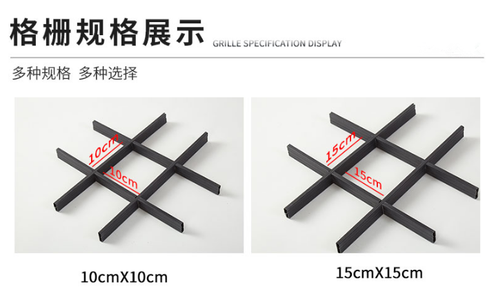 鋁格柵吊頂格子尺寸:分別有50 X 50,75 X 75,100X100, 110X110, 125X125, 150X150,175 X175, 200X200、250X250、300X300 (格子大小可根據(jù)需求進(jìn)行選擇)