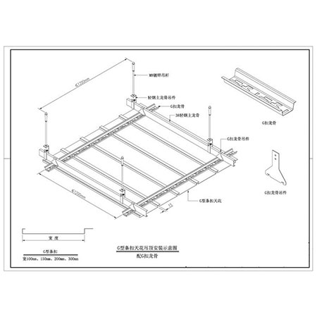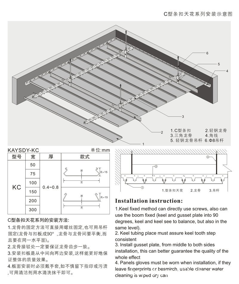 ②、吊桿間隔、頂端間隔墻面、龍骨的間隔等都與C型無縫鋁條相同。